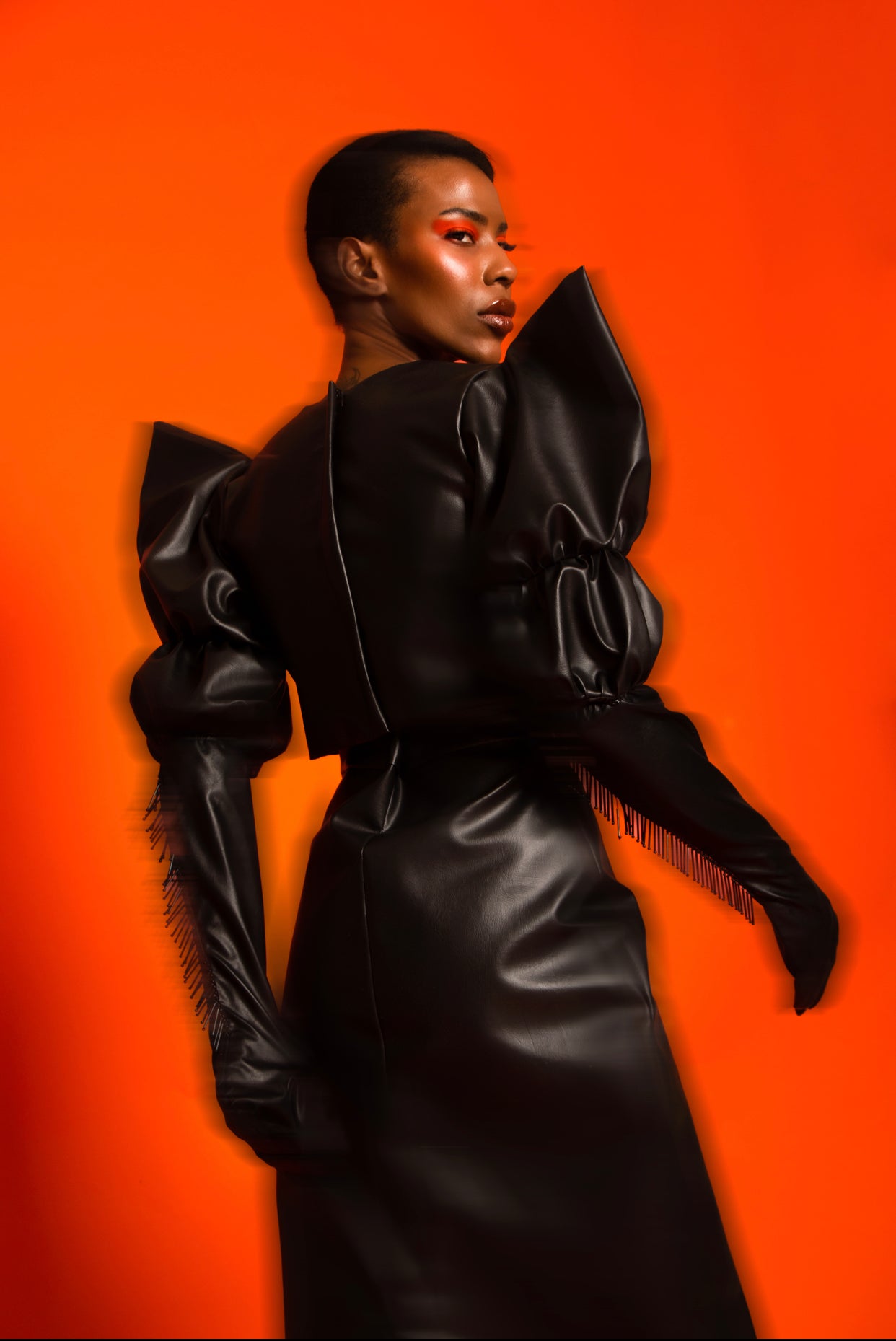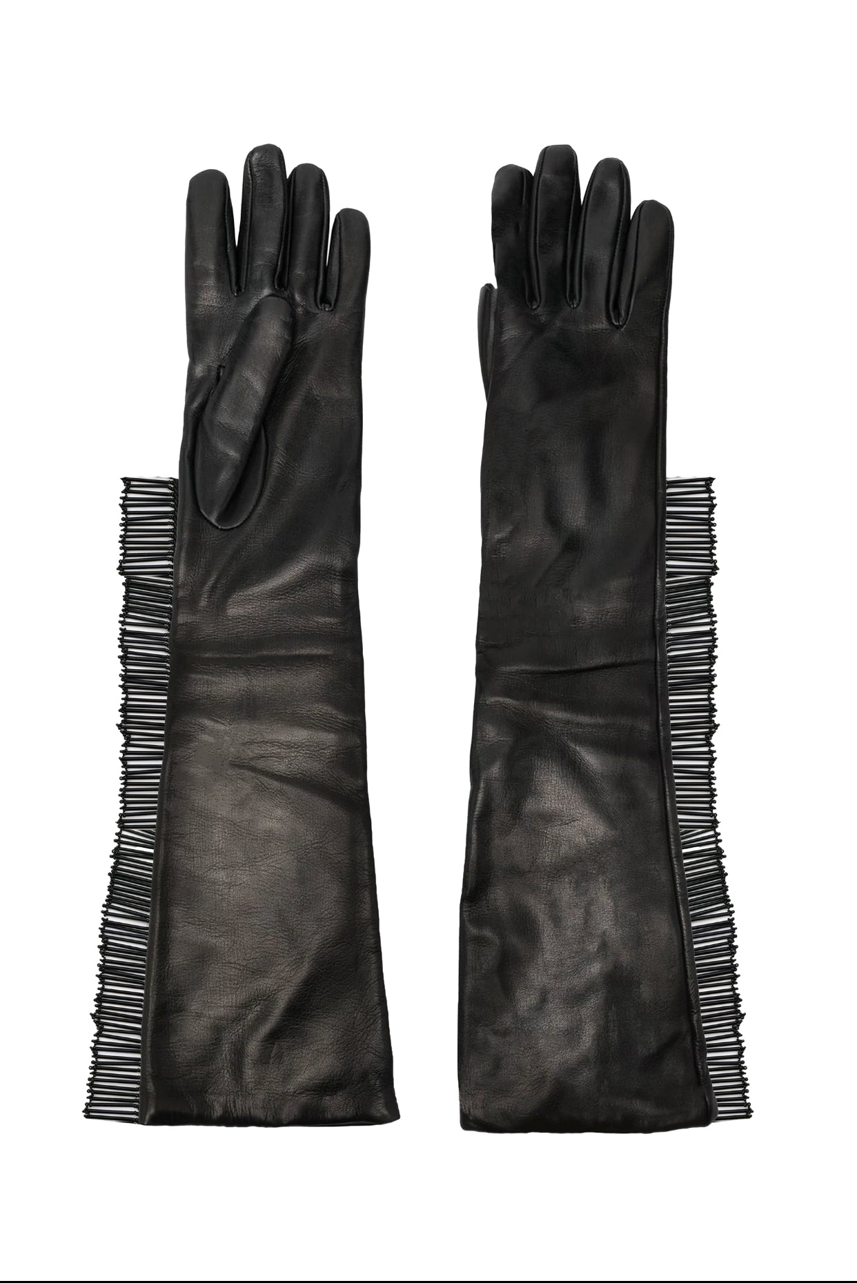 Make a bold style statement with this winter-season crop top. Crafted in faux leather features a bold double-sleeve with detachable gloves with a free-flowing glass tube beaded fringe. Match its distinctive style aesthetic by wearing the Armor Skirt.