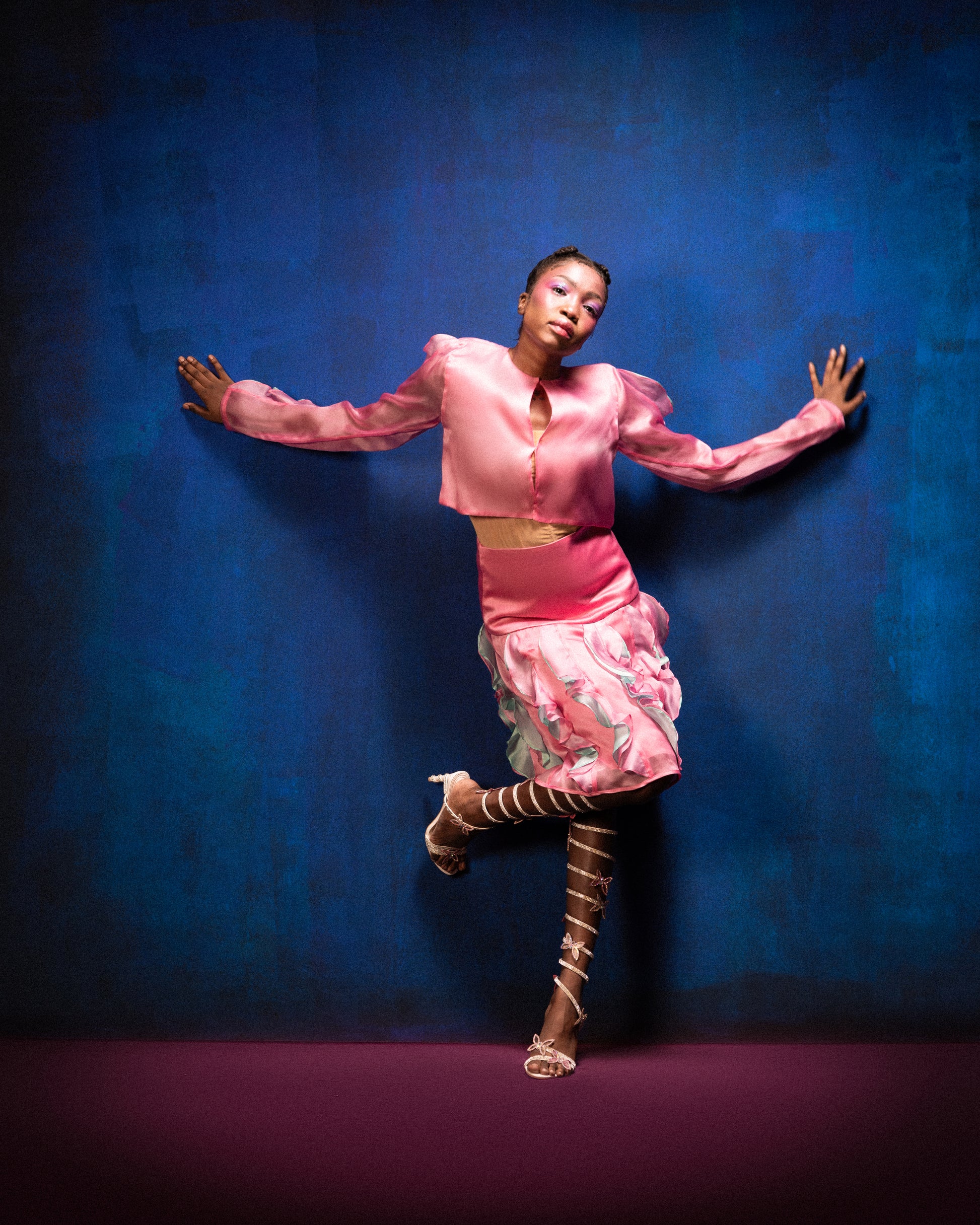 The hip-cut pink mini skirt made of pure silk organza showcases pink and blue ruffles on the skirt and is complemented by a pure pink silk lining. The pink and blue hues blend to produce a mesmerizing double-vision effect.