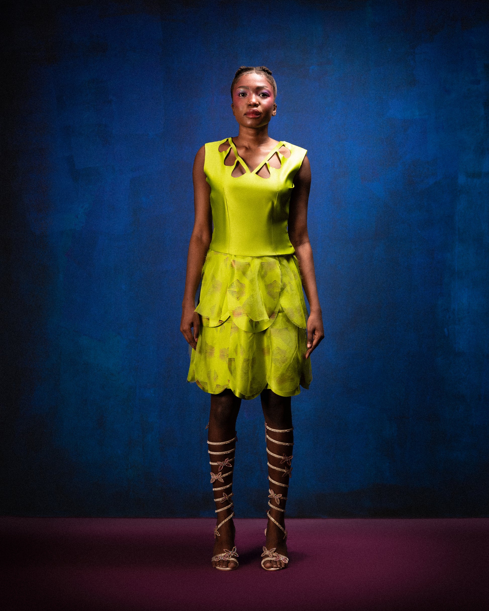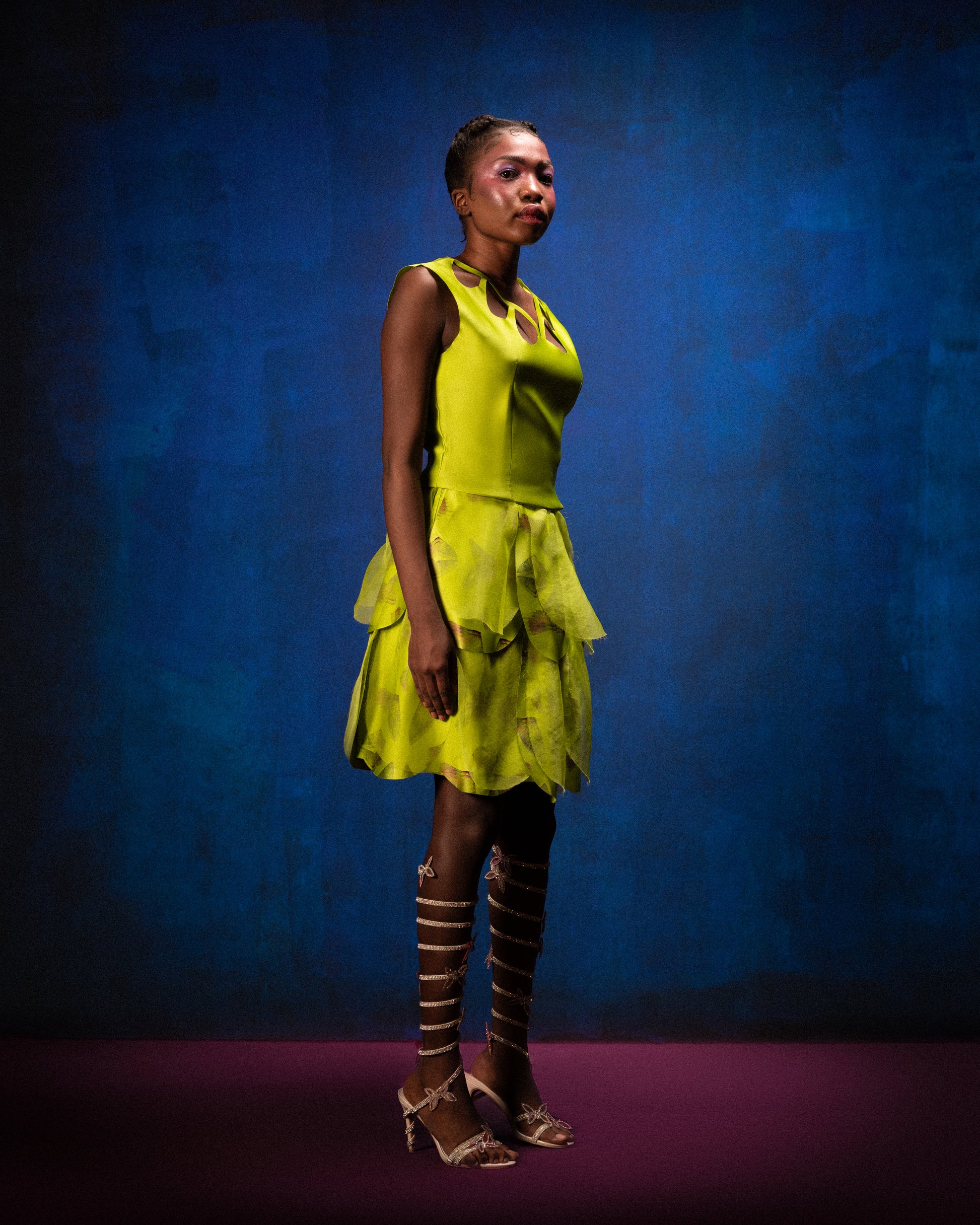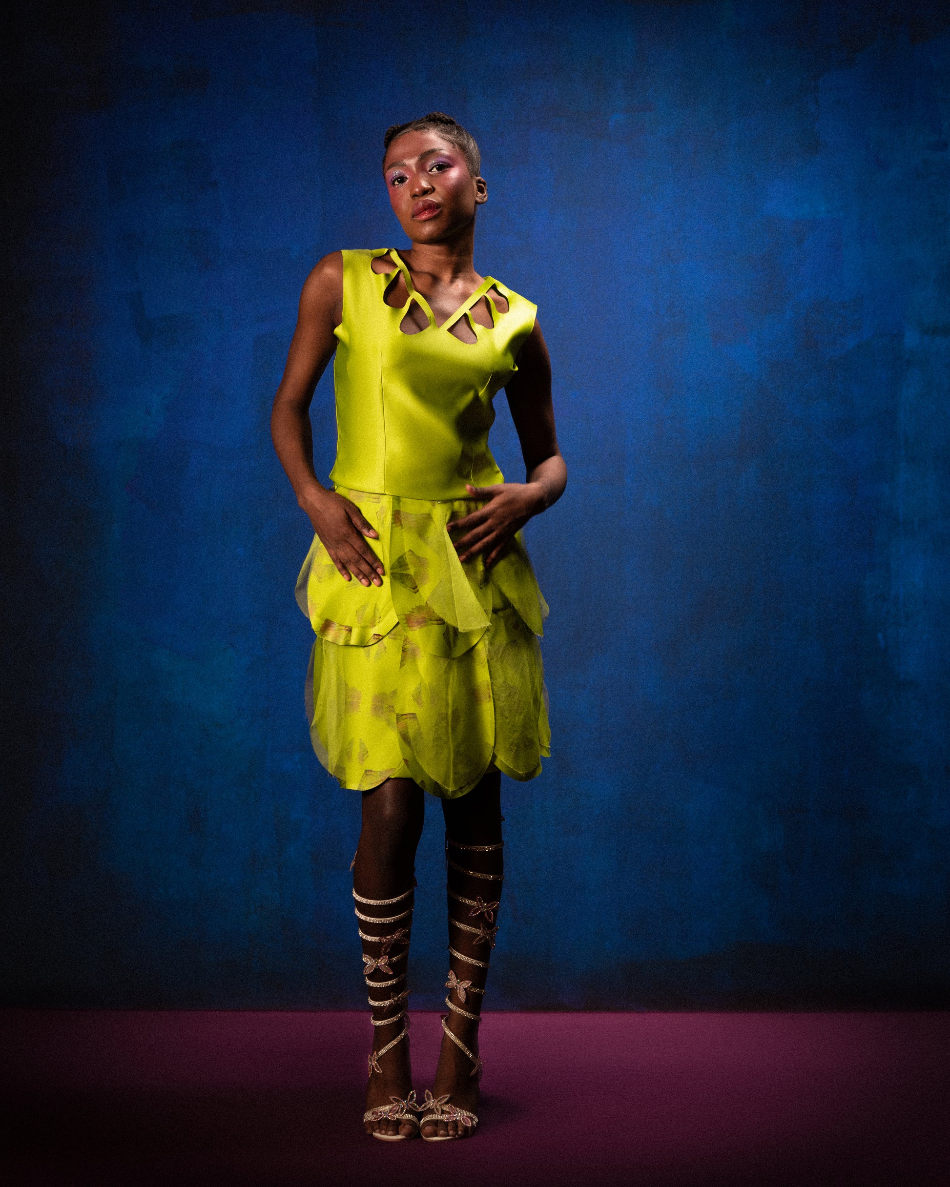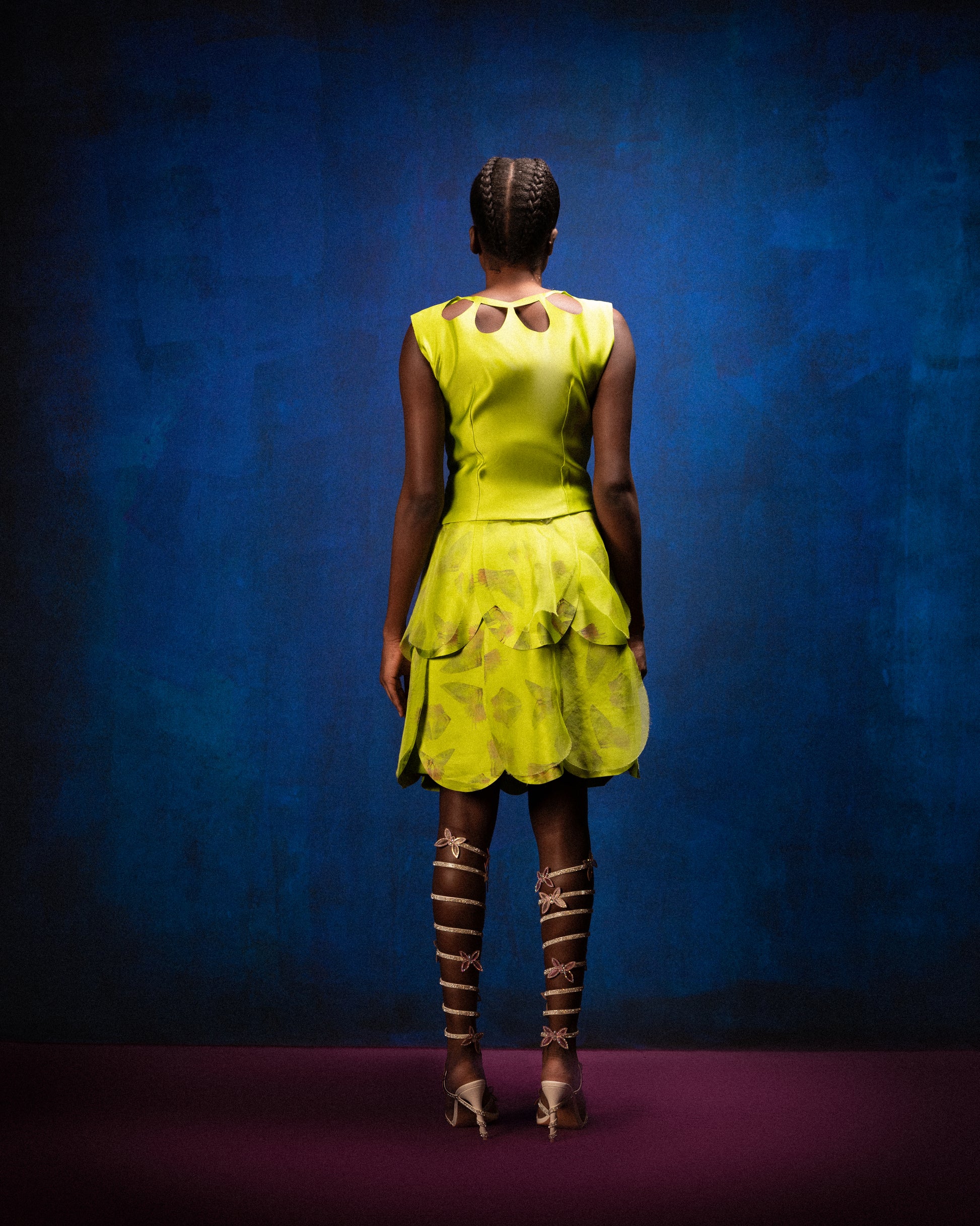 The lime green top is crafted from luxurious satin taffeta, entirely cut with precision laser technology, ensuring intricate cutouts that elegantly mimic butterfly wings. With no traditional seaming, the laser-cut finish offers a sleek and seamless look.