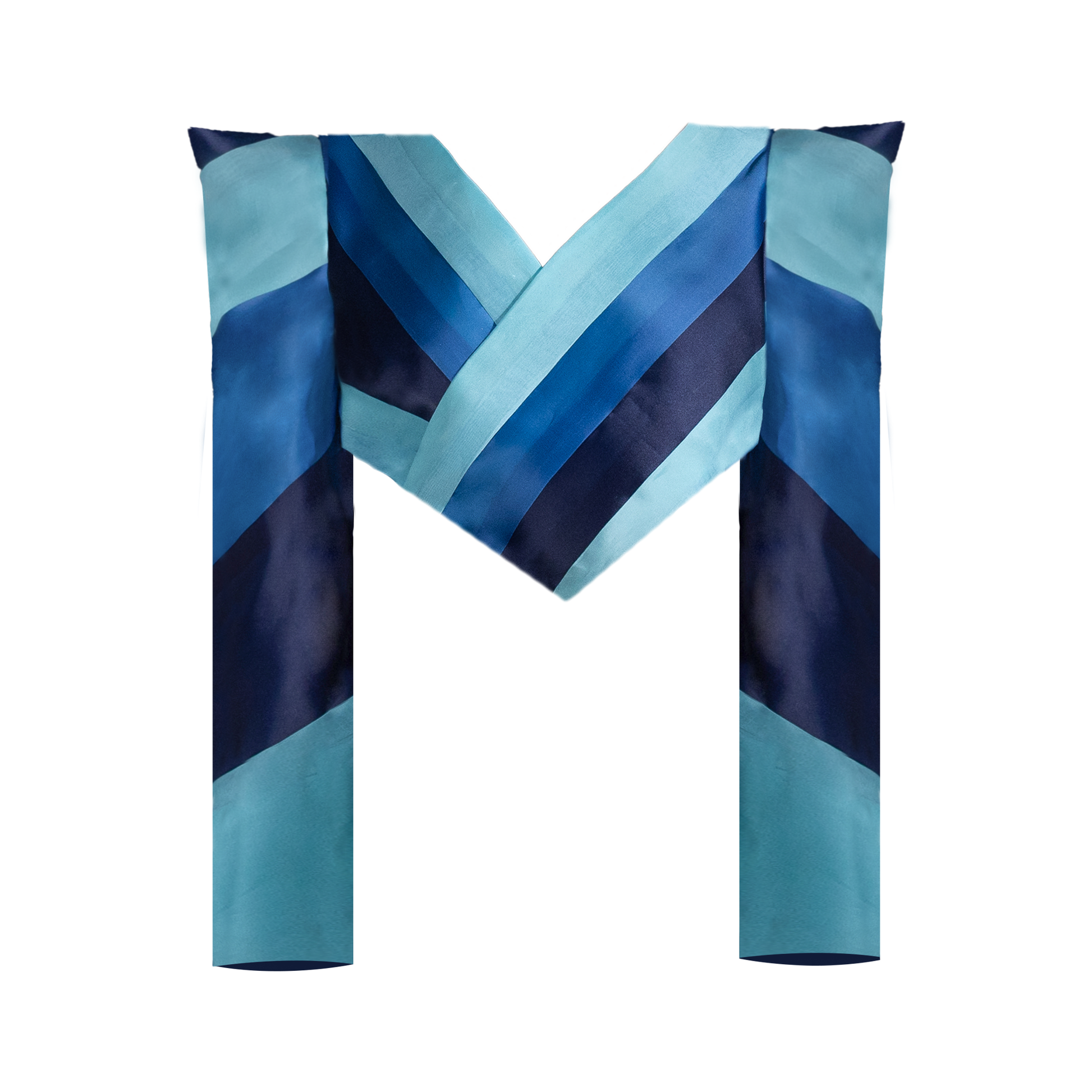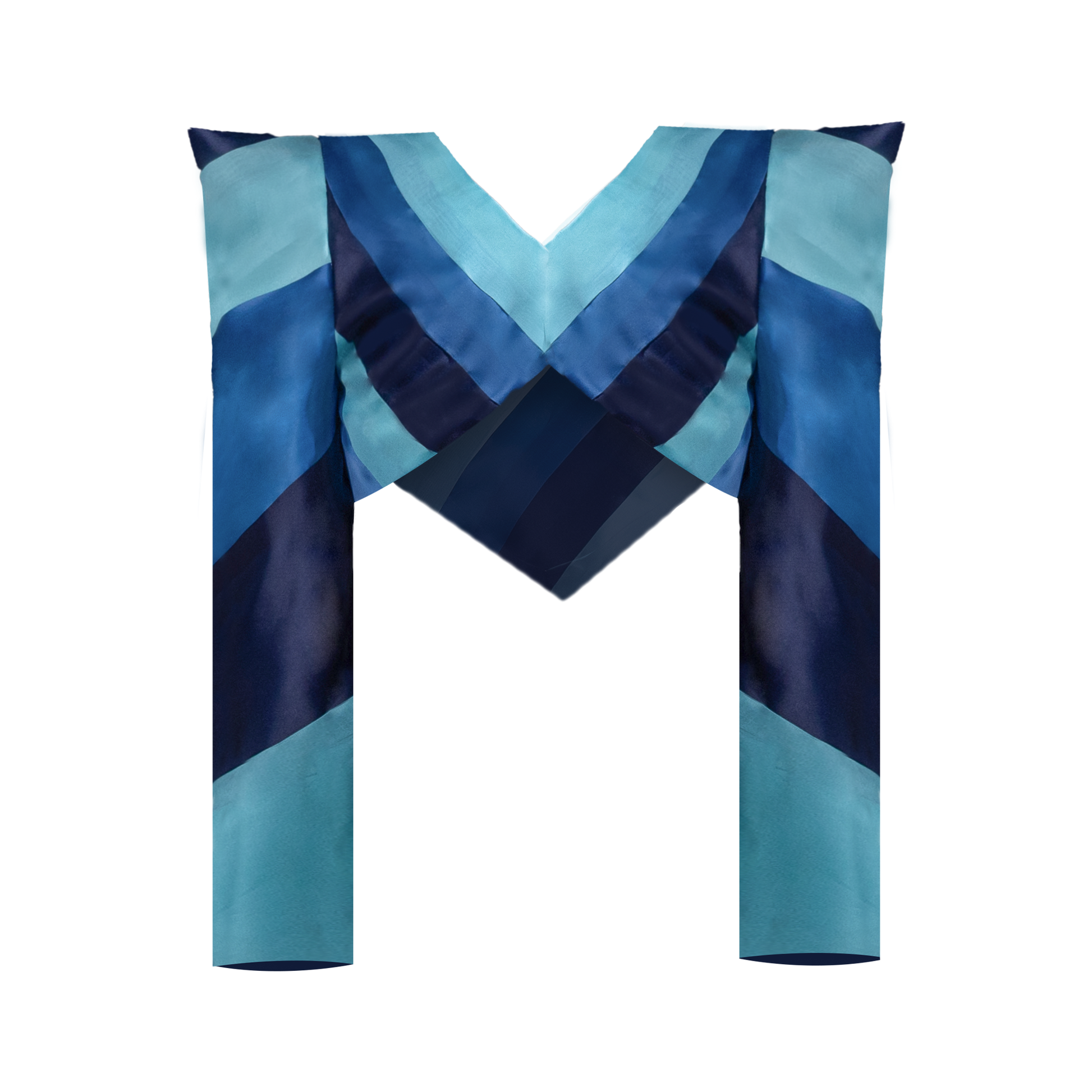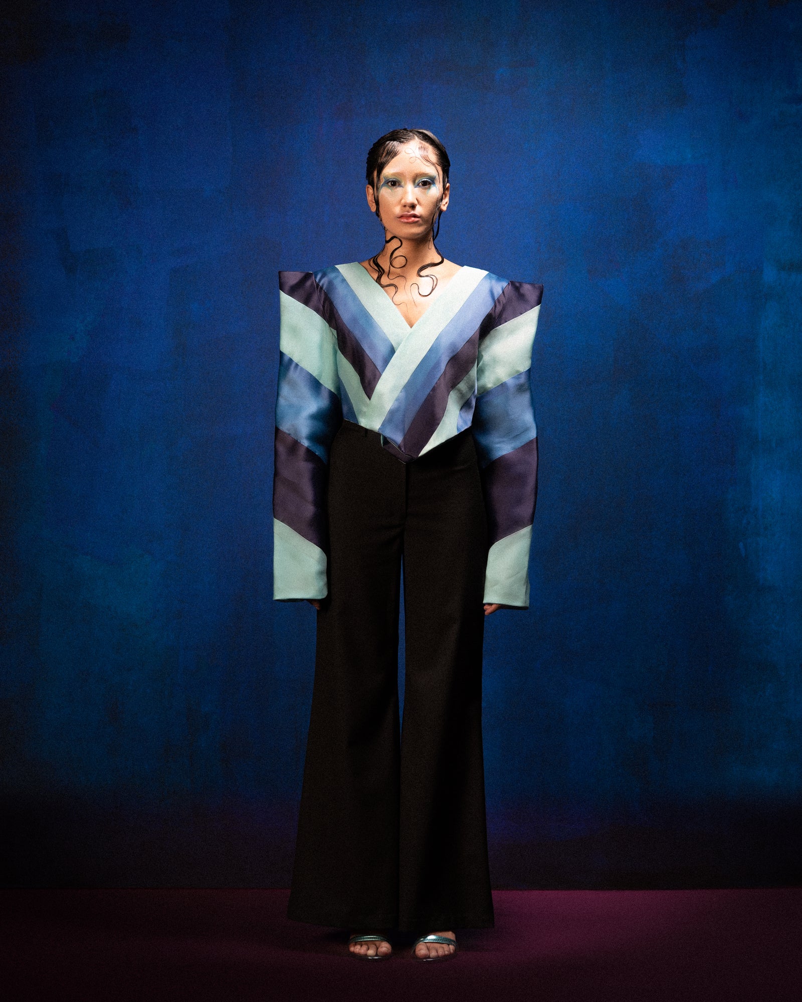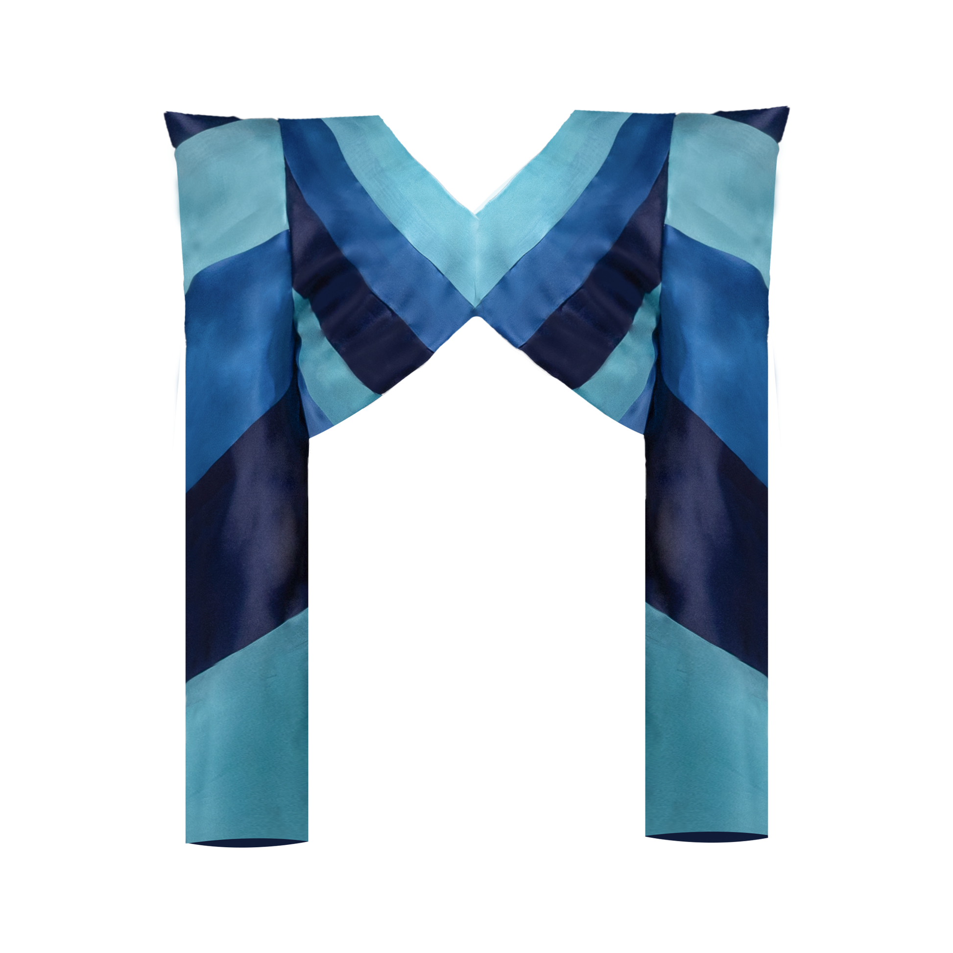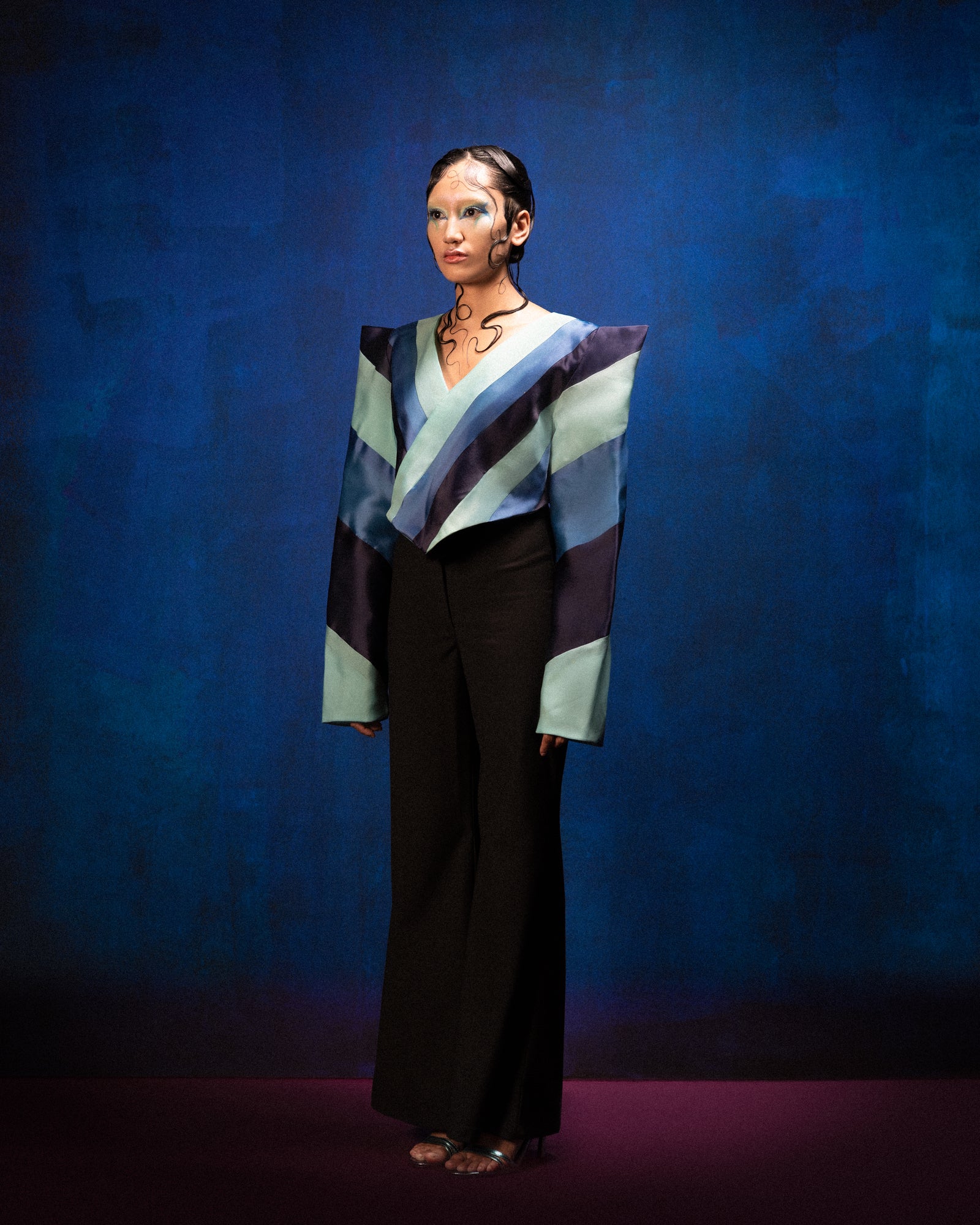 The double vision illusion is crafted from pure silk organza in blue shaded stripes, seamlessly connected to form the cropped jacket. This design features bold shoulders, maxi sleeves, and a back angle cut.