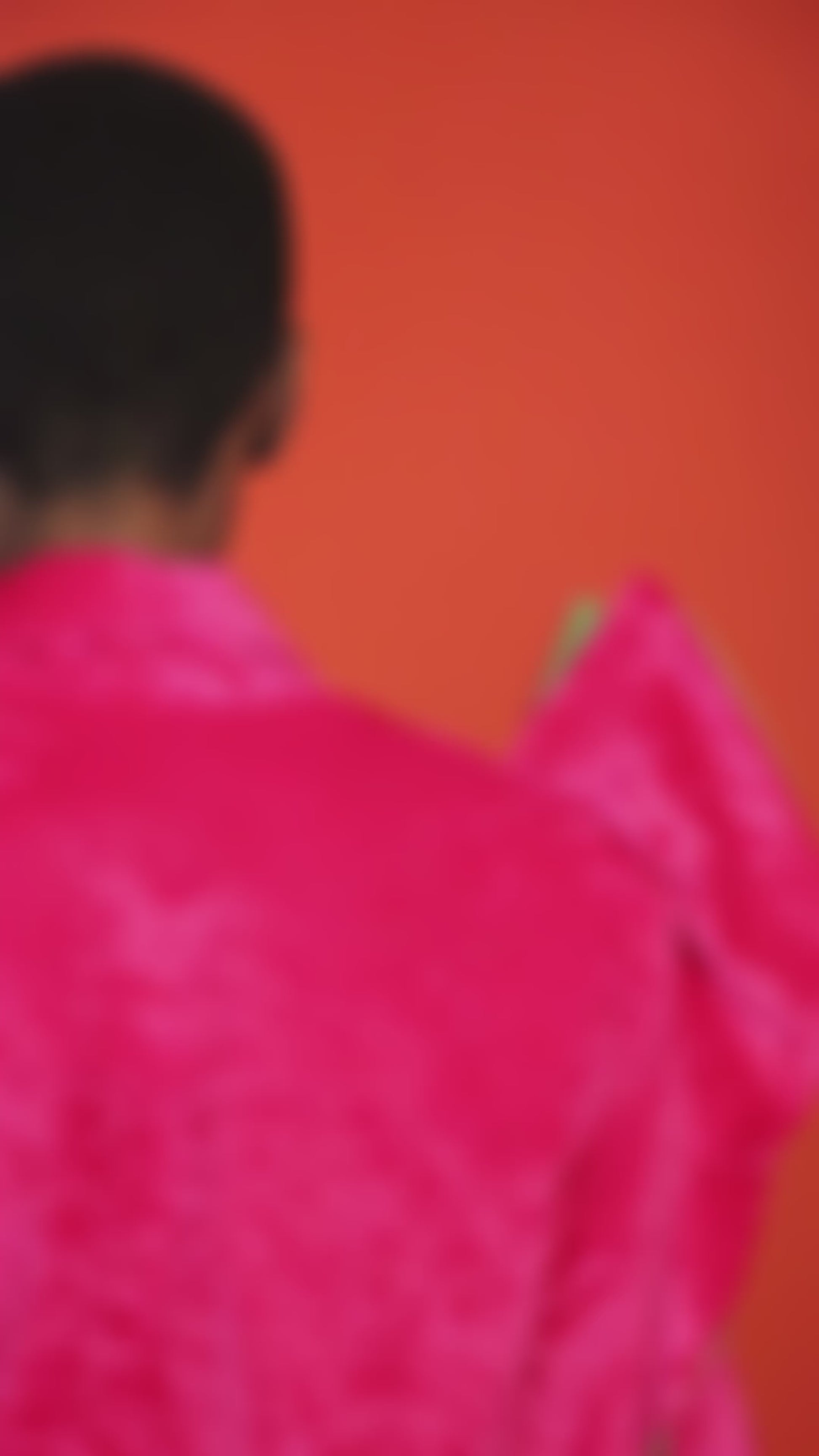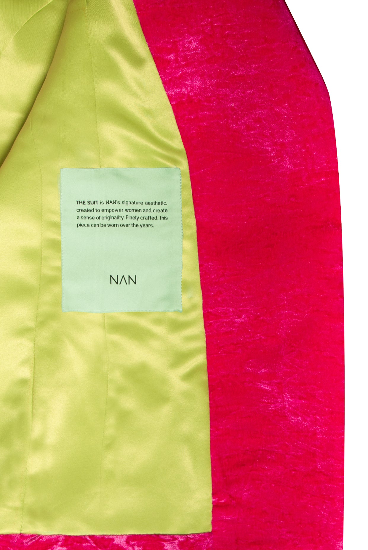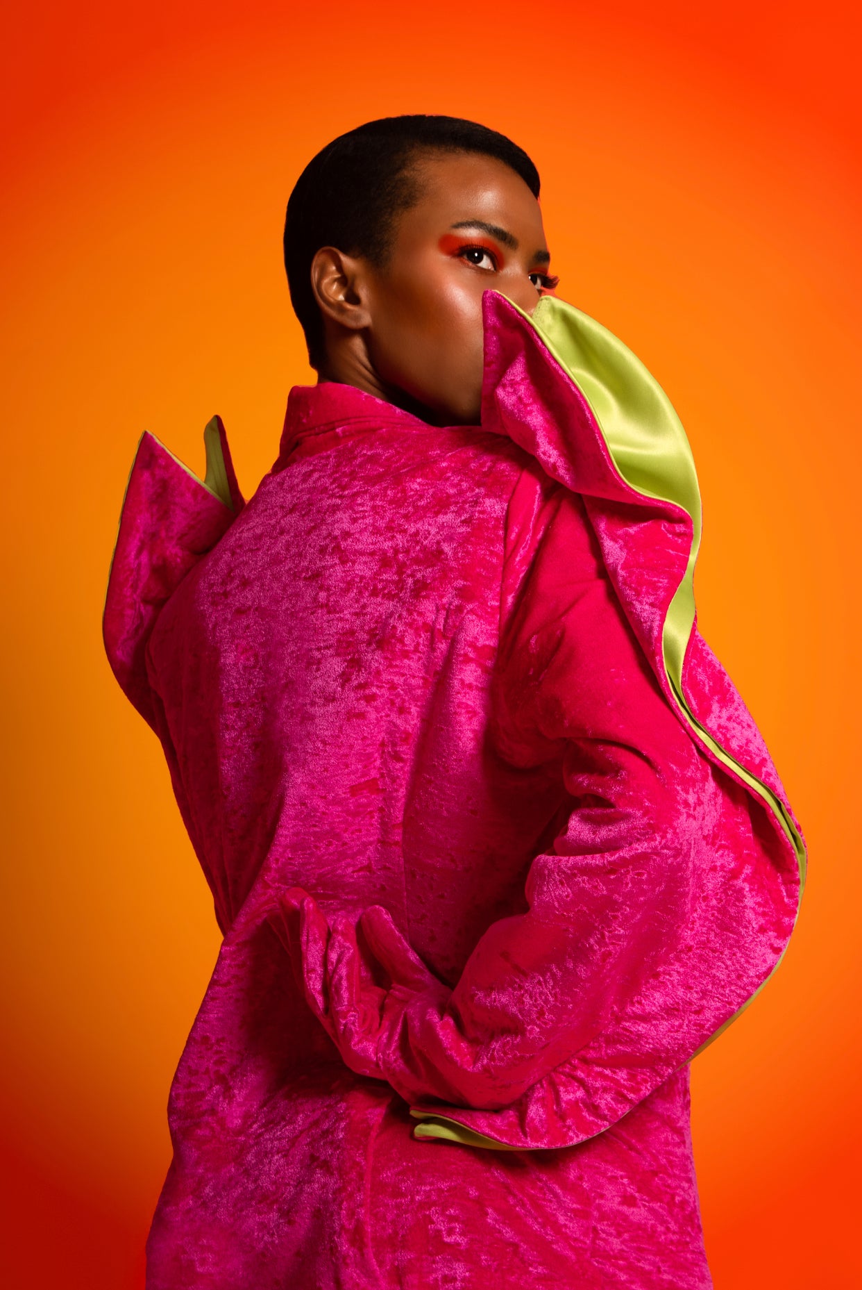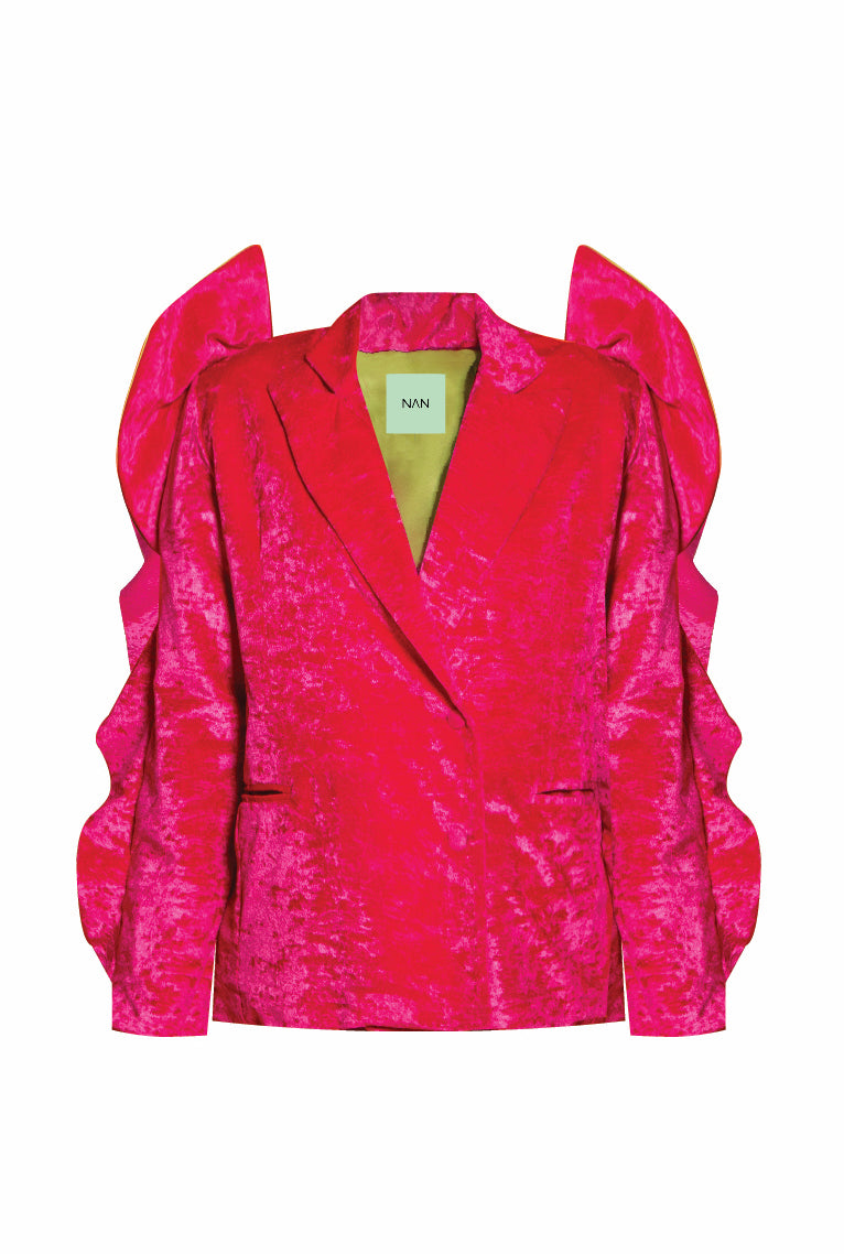 The boxy suit jacket is expertly constructed from a combination of hot pink crushed velvet and green silky taffeta lining. The impressive silhouette features winged double symmetrical ruffles detailing at the sleeves with padded shoulders.