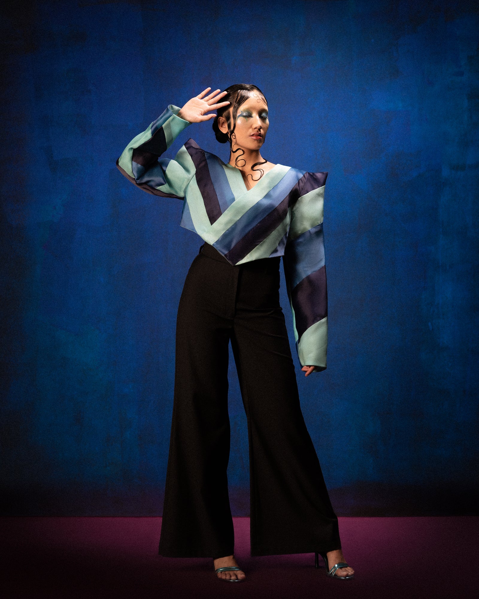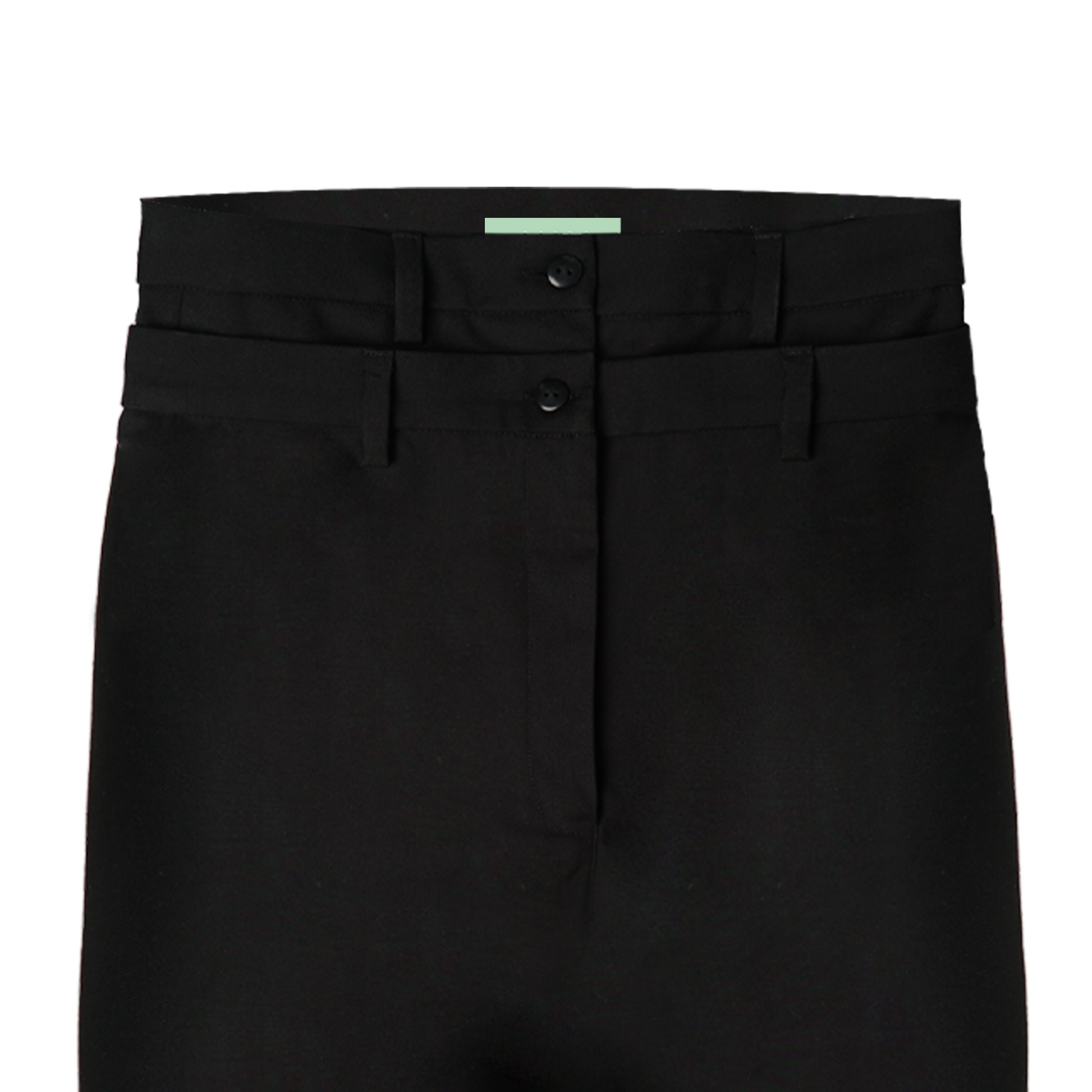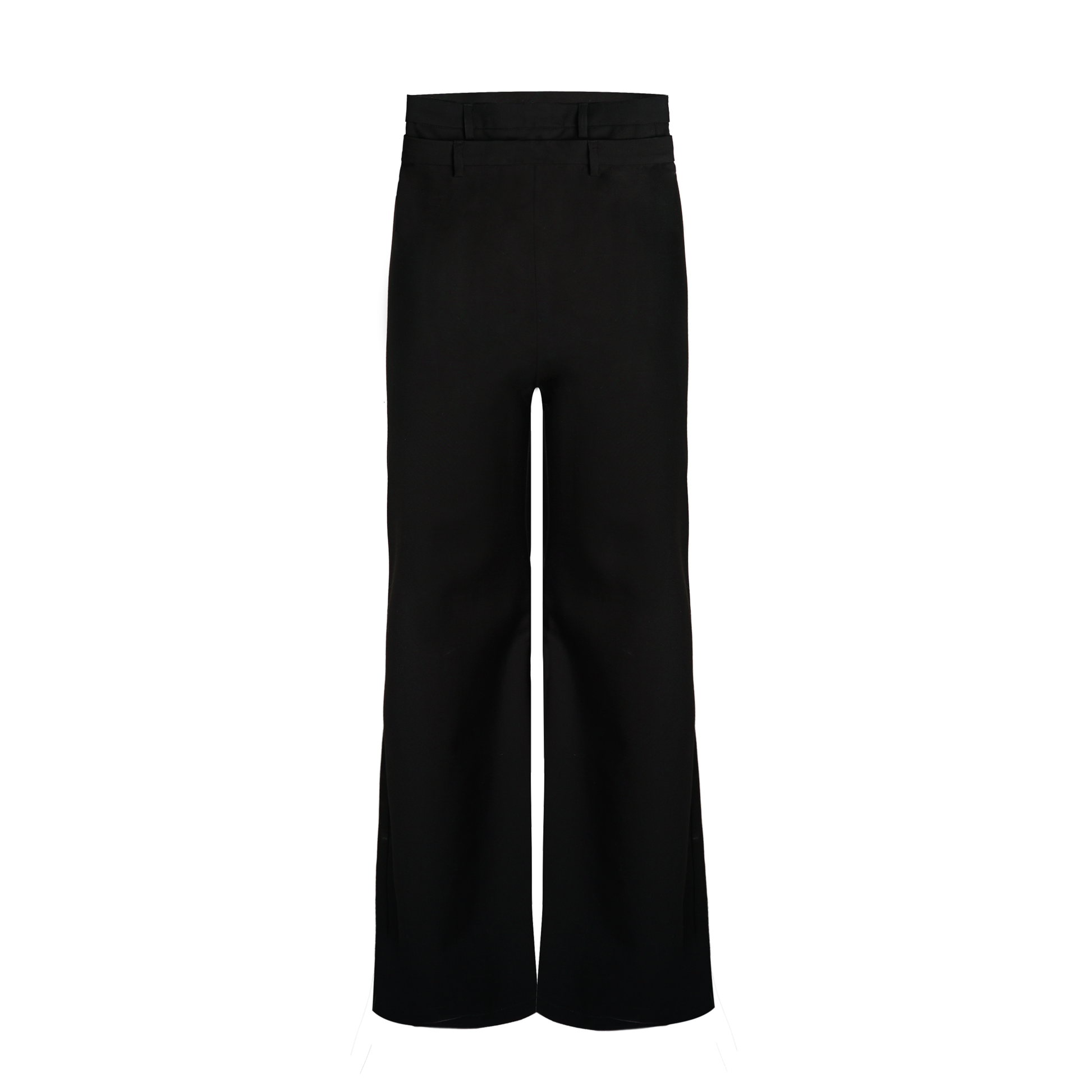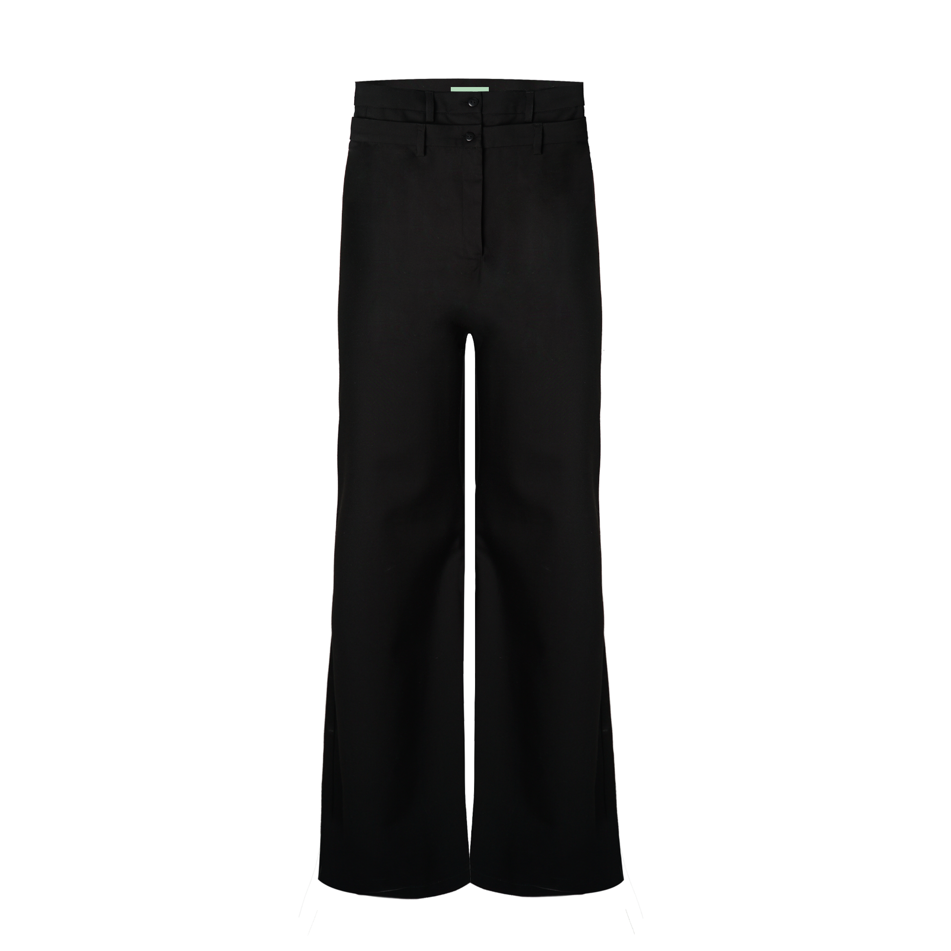 The high-rise wide leg pants feature a double waistband and are crafted from a black cotton-linen blend, making them perfect for both formal occasions and casual wear, and versatile enough for everyday use.