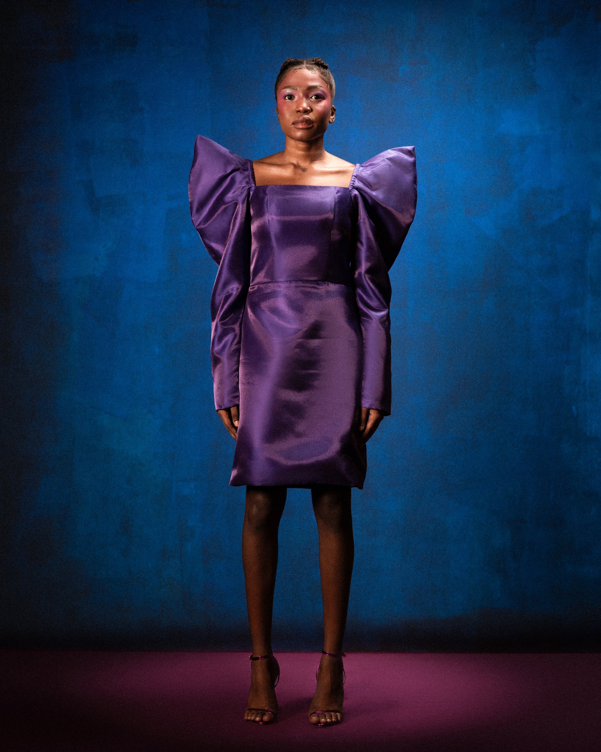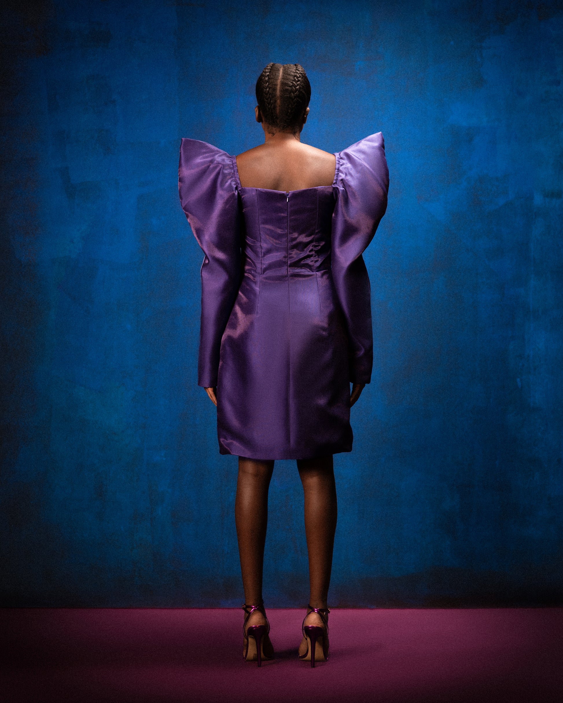NAN's signature dress in Violet showcases eye-catching, unconventional shoulders inspired by butterfly wings and daring, vibrant shades. The dress is crafted from luxurious Taffeta Lamé fabric, boasting a stunning glossy finish that catches the light beautifully. The bold sleeve design and the sleek pencil silhouette at the bottom create a captivating and elegant look.