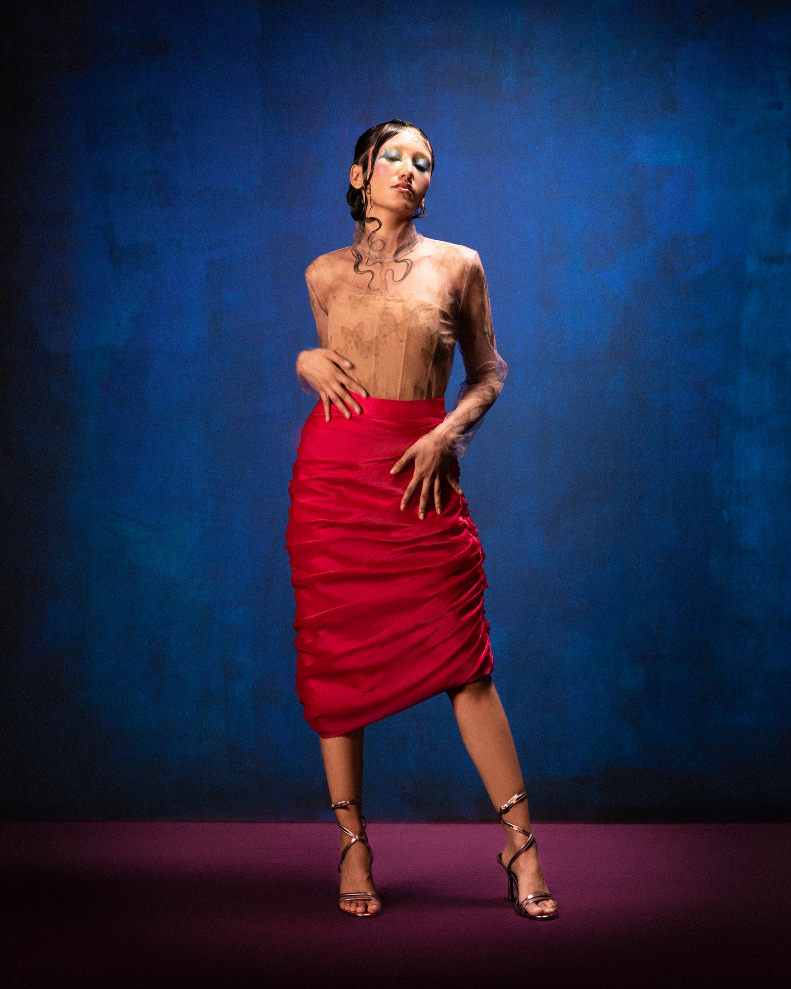 A midi skirt crafted from fuchsia metallic crushed organza lamé featuring an asymmetrical hand-draped design.