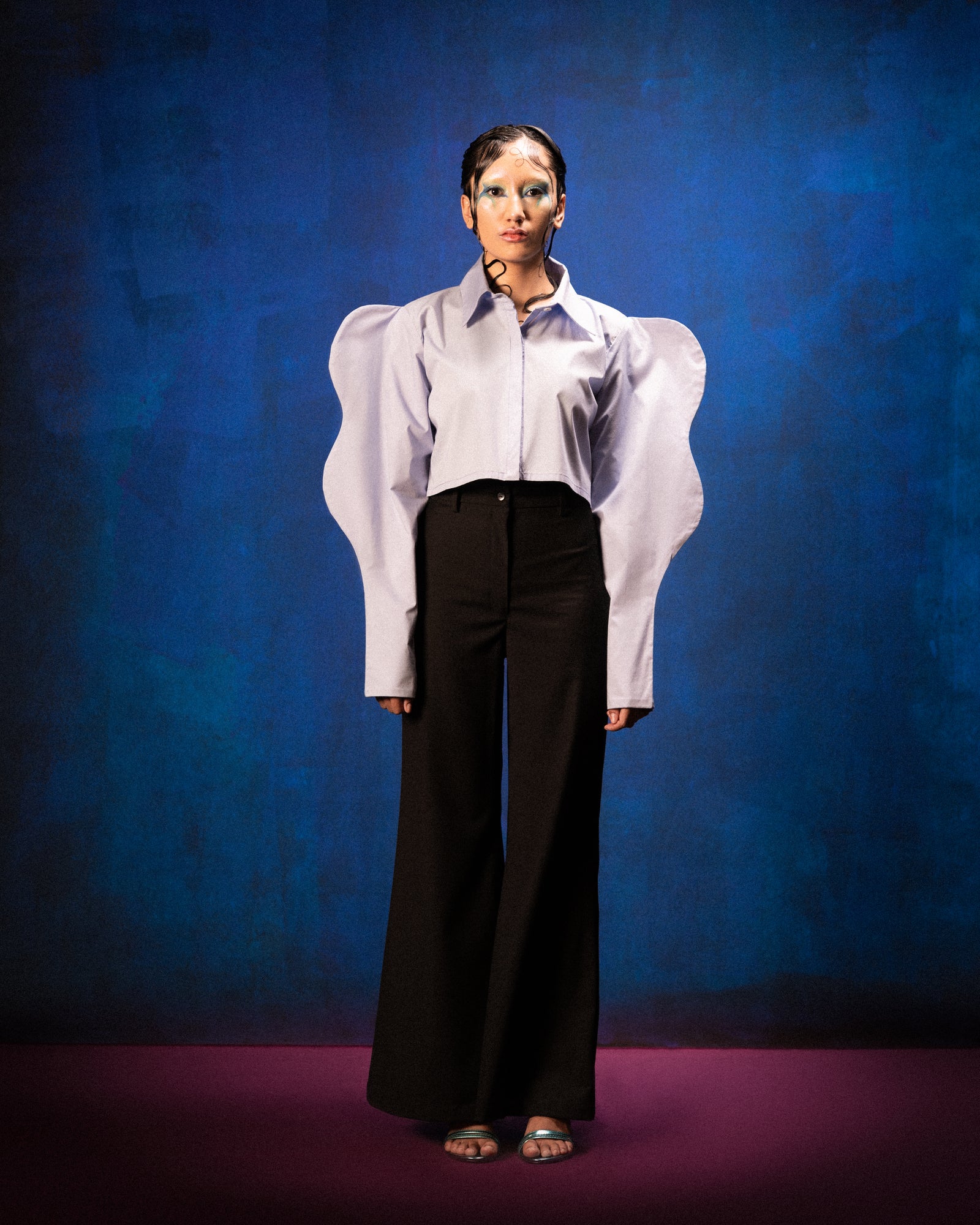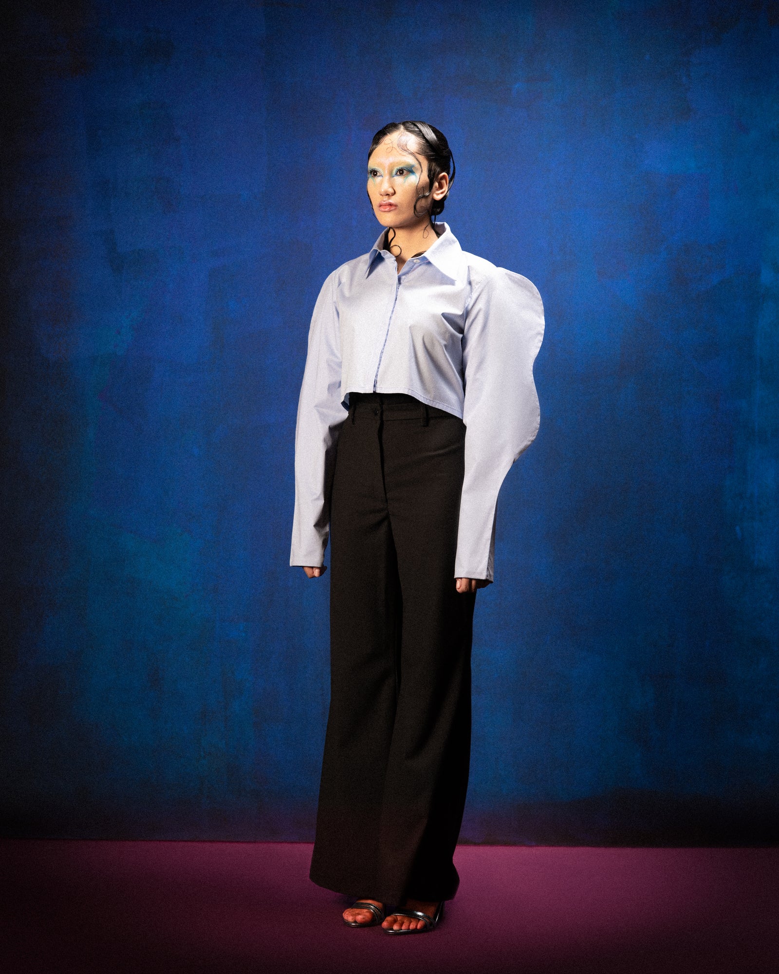 The cropped shirt is made of light blue cotton and features a bold butterfly sleeve.